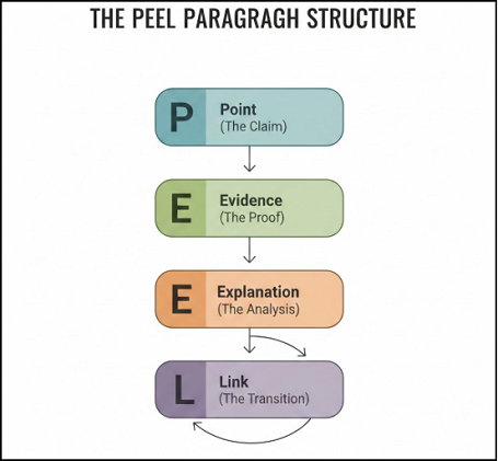 To ensure your writing remains focused and professional, utilize the PEEL structure for every body paragraph: